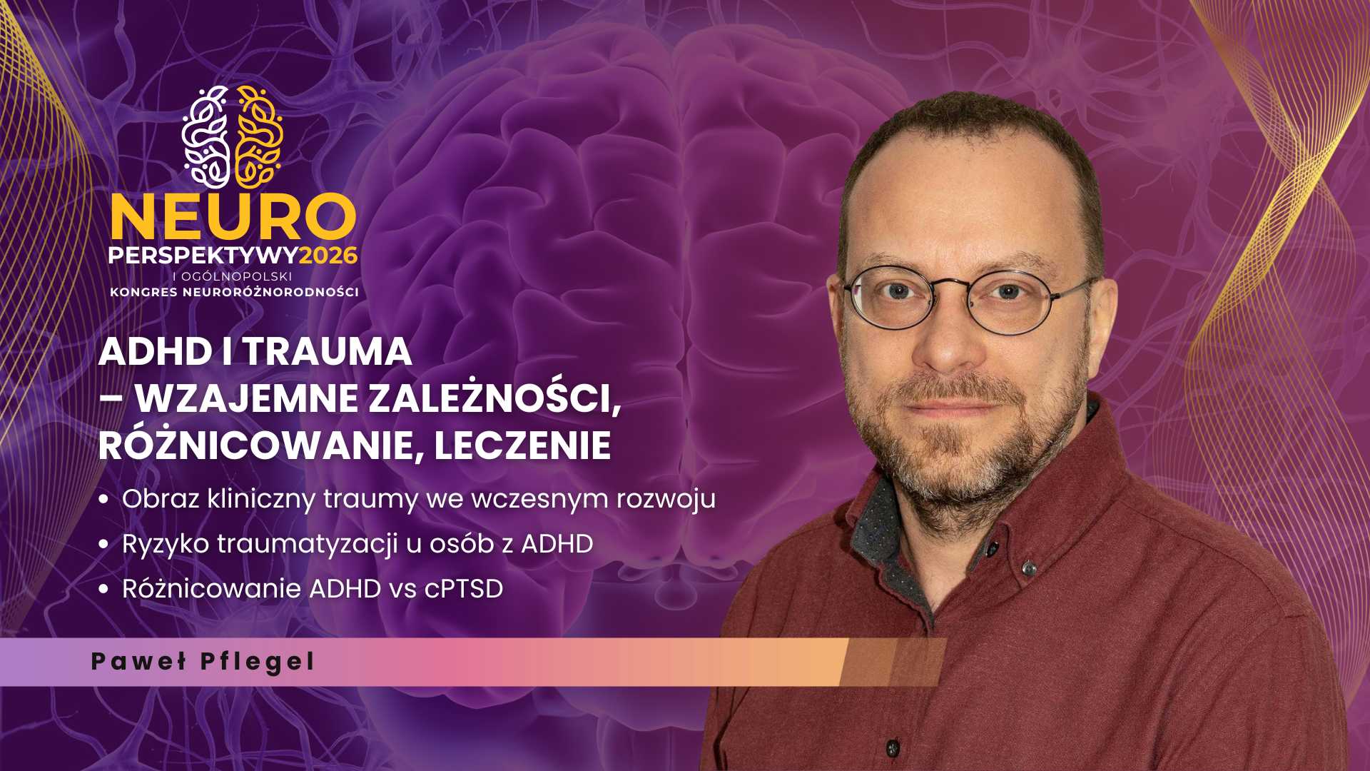 Paweł Pflegel, psycholog, psychotraumatolog oraz diagnosta dzieci, młodzieży i dorosłych z ponad 30-letnim doświadczeniem zawodowym, podczas Kongresu Neuroperspektywy 2026 podejmie temat złożonych relacji między ADHD a traumą. W swojej prelekcji pt. "ADHD i trauma – wzajemne zależności, różnicowanie, leczenie” skupi się na diagnostycznych i terapeutycznych wyzwaniach, które pojawiają się na styku neurorozwojowości i doświadczeń traumatycznych.
